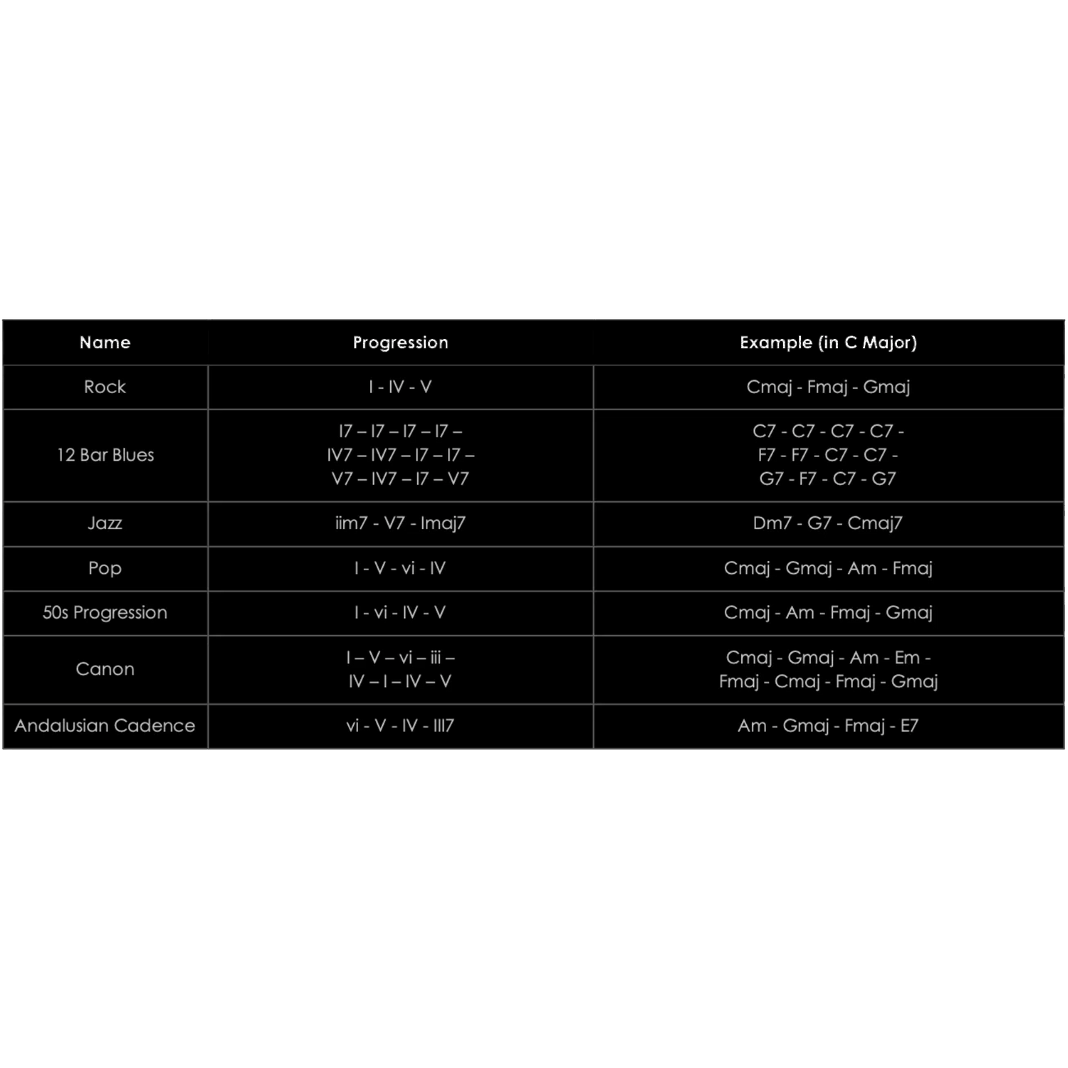 The chart to the side gives some more progressions that have been commonly found in famous recorded music. Some of these progressions will even introduce the black keys!