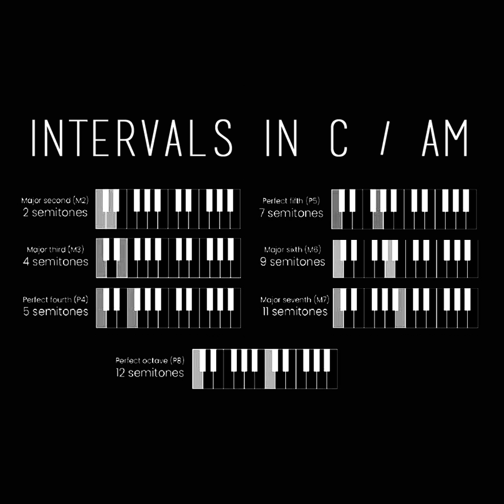 Another great way to level up your ears is training them to hear intervalic chord changes. Or the distances in between the notes and chords. Check out the chart to the side to learn the names of all your intervals. To stay in the "key of C/ Am" only apply the white keys. (You can learn more about intervals including the names of ALL of them HERE)